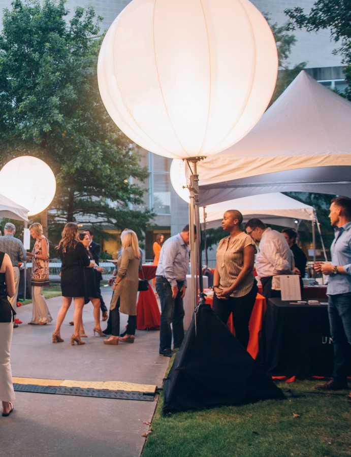 Moon balls are set up on a tripod stand that can be raised 12 feet in the air. They require a single standard outlet for power that runs both the motor and light. Moon balls are typically used on a bright white setting but can also be set up on a wide variety of different colors. If you choose to use the moon balls on a bright white setting each unit consists of two 100 watt LED bulbs lighting up a 40′ x 40′ area.